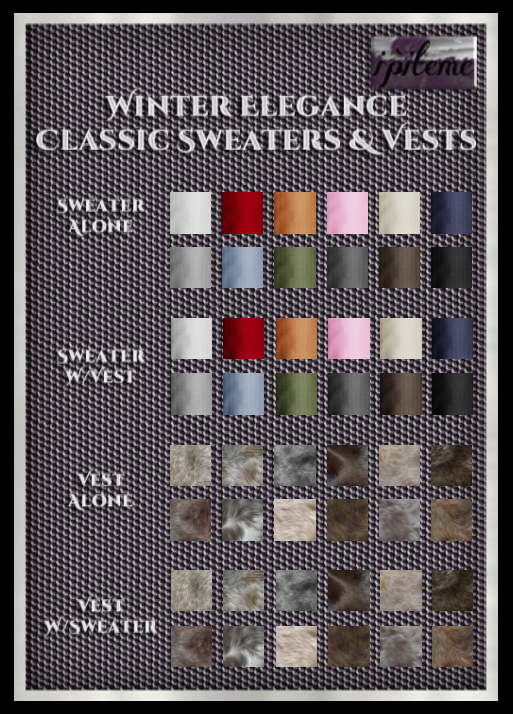 There are 2 color/texture HUDS for the sweater and vest. This one on the left is the Classic HUD giving you 12 pretty colors for the sweater and 12 patterned fur choices for the vest.